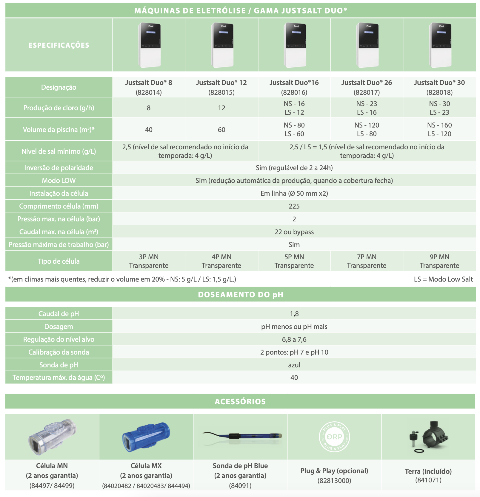 O equipamento JustSalt Duo® da Pool Technologie, apresenta uma solução integrada para a produção de cloro e controlo do nível de pH da água da piscina. Equipado com bomba peristáltica, a JustSalt Duo® monitoriza continuamente o nível de pH, ajustando correções automaticamente conforme necessário. Modelos disponíveis para piscinas até 160 m3.